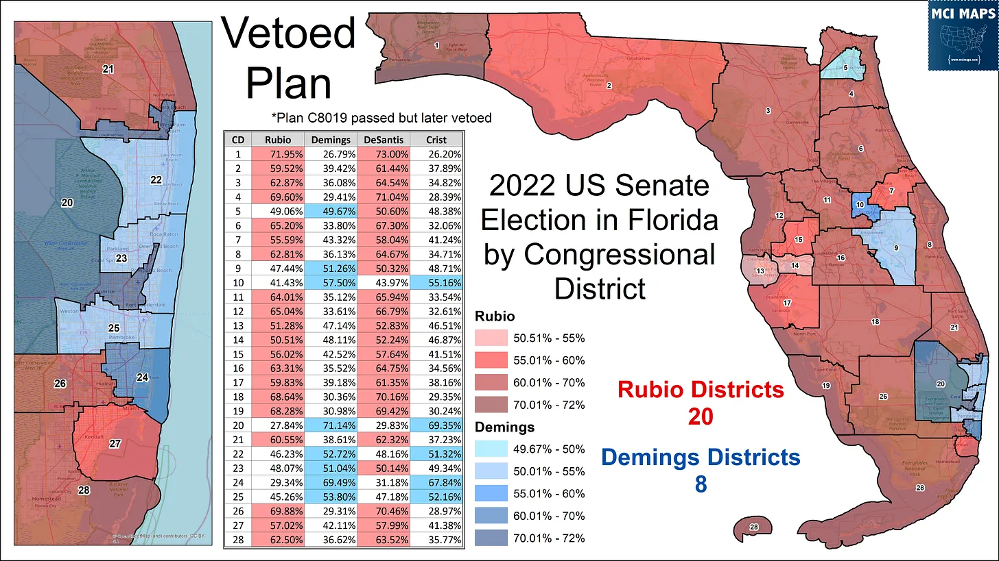 Nevertheless, MCI Maps data shows Rubio and DeSantis won the district anyway. At least in a year when Republicans overperformed statewide, the choice of maps appeared to deliver little impact in outcomes.