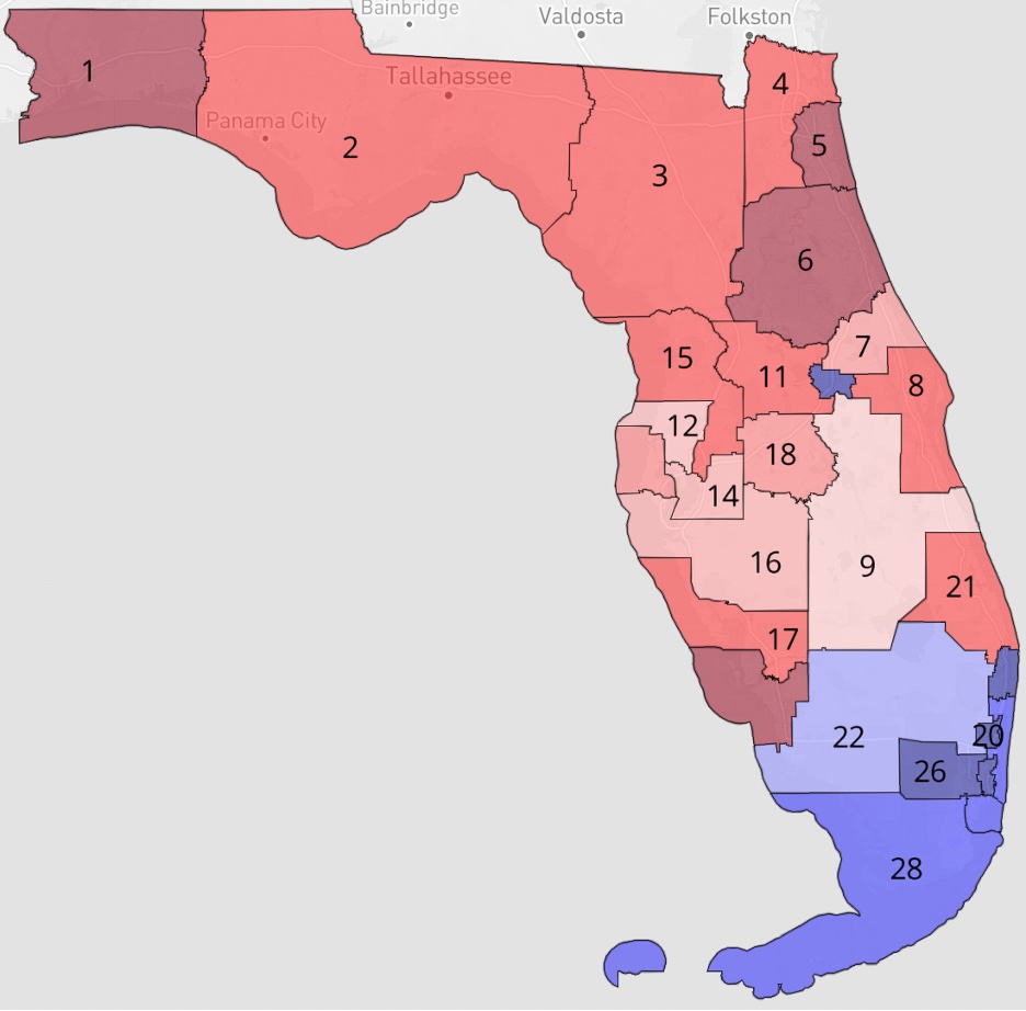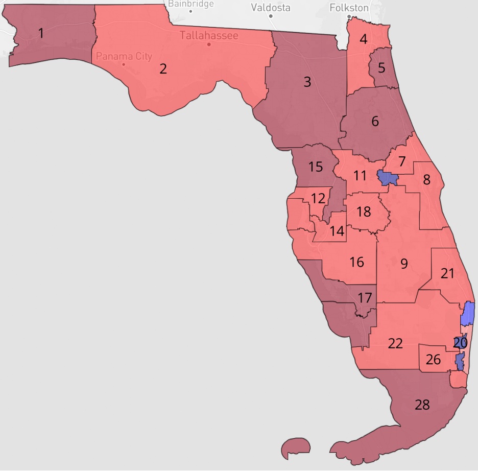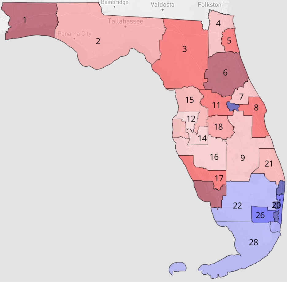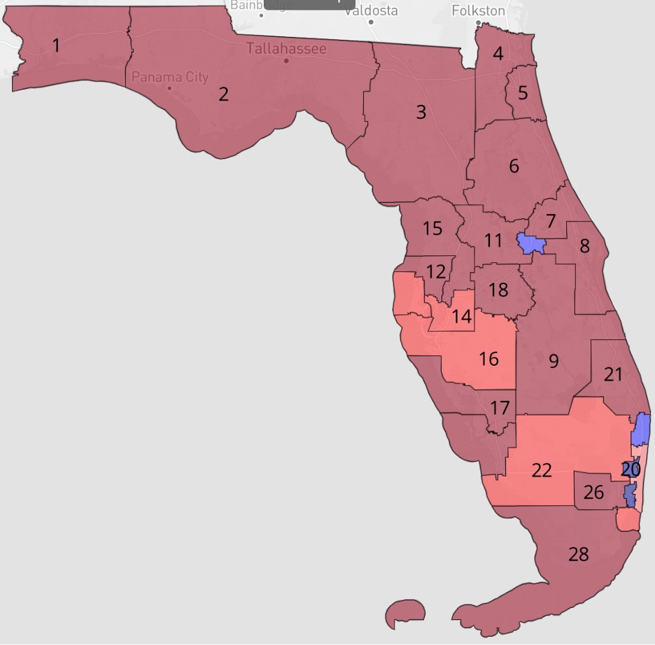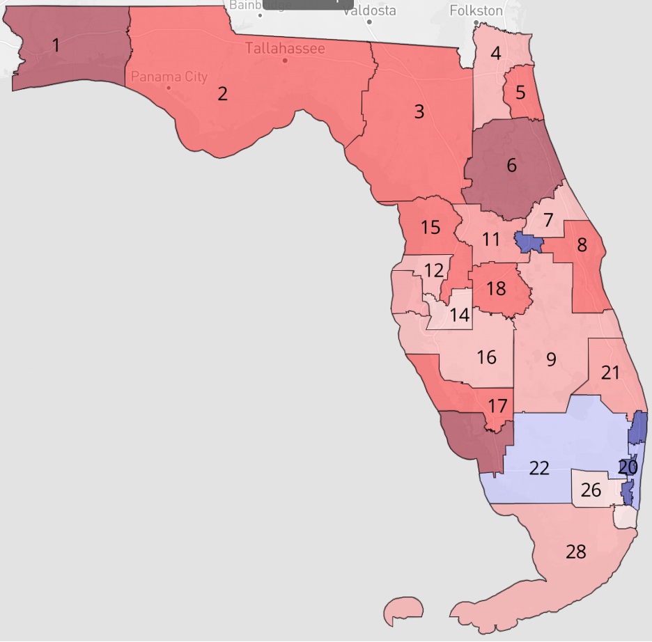The best indicator of partisan tendency remains how voters performed in the most recent Presidential Election. Based on that, Republicans would net four seats, growing their share of the U.S. House delegation to 24 seats compared to just four for Democrats. The gains come in the loss of Democratic seats in Tampa Bay and Central Florida, as well as the disappearance of two Democratic seats in South Florida. Of note, two of those seats, Florida’s 14th and 22nd Congressional Districts, have a partisan lean that falls within 10 percentage points but still tilts Republican, according to Dave’s Redistricting. Trump won Florida in his last run with 56% of the vote.